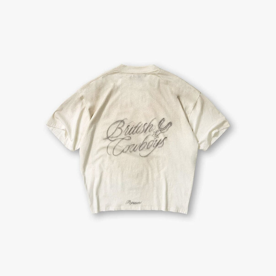 British Cowboys T-Shirt in Washed Ecru, a boxy silhouette crafted from a lightweight cotton and hemp blend with a washed vintage finish. Designed to feel worn-in from the first wear, this t-shirt balances soft structure with raw detailing and expressive graphic treatment.