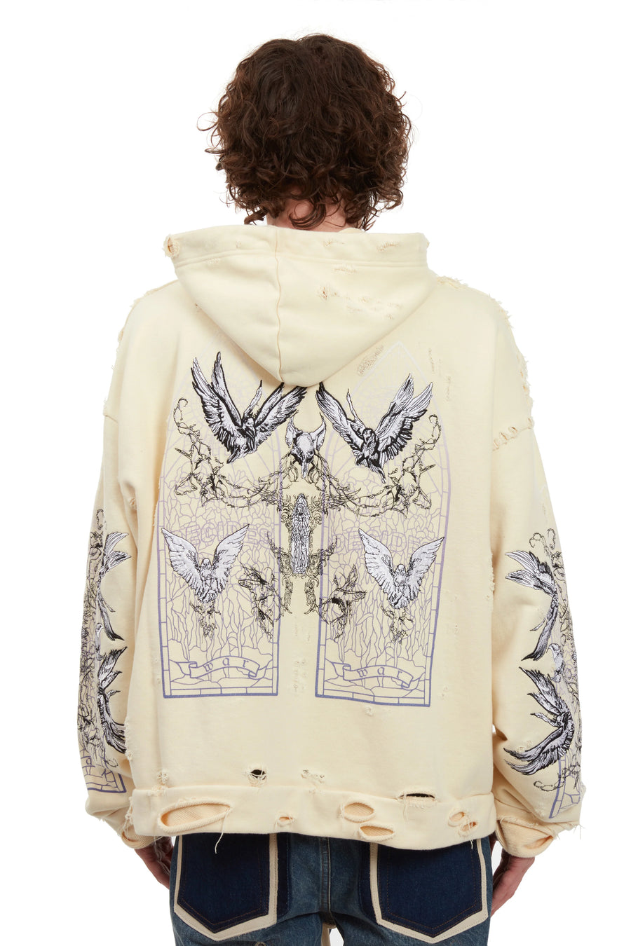 The Ascension Hooded Pullover is constructed from 100% cotton, and features original artwork applied by screen print and embroidery. With intentional distressing and design placement this adds a distinctive touch. Featuring a boxy and slightly cropped fit, following your normal size is recommended.